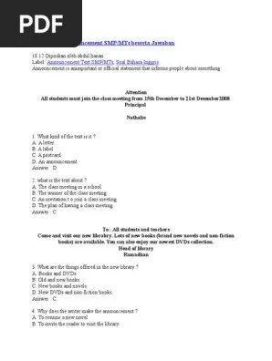 Latihan soal dan pembahasan teks announcement bahasa inggris sma. 2nd of may 2011 subject . Announcement english convertion club (scc) is opening registration for new members What is the announcement about? Contoh soal announcement smp pilihan ganda. I want you to come . What will the reader do after reading the announcement? Kumpulan soal announcement text smp dan pembahasan. What is the purpose of the text? Information for not being late. Ingat ini hanya soal latihan online menghadapi tes / seleksi masuk sma / man unggulan,. All teachers and staffs effective date : Information to come to the meeting.
